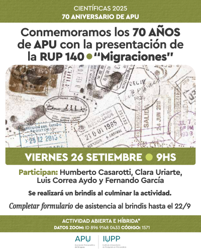 Coordina: Psicoanalista Claudio Danza, Director de la Comisión Científica. Los esperamos. Actividad gratuita y sin inscripción previa. Comisión Científica de APU. https://us02web.zoom.us/j/89691480433?pwd=5VkNbn8zy9lX2pu3RnWGAvzBFxziWn.1 ID: 896 9148 0433 Código: 1571